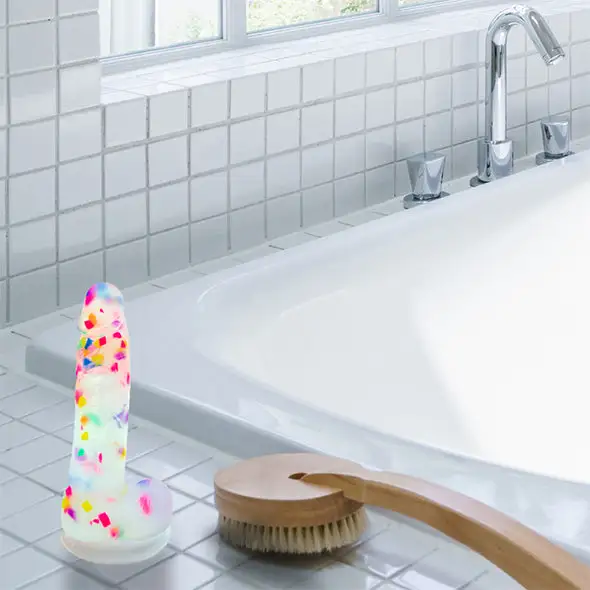 Laat het feest beginnen met deze matte siliconen dong met een leuk regenboogconfetti-ontwerp en een realistische textuur. Deze dong heeft een superieure zuignap en is compatibel met een harnas, zodat je kunt beslissen hoe je wilt spelen.