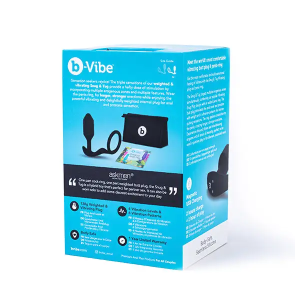 Sensatiezoekers verheugen zich! De drievoudige sensaties van onze gewogen en B-Vibe Vibrerende Snug Buttplug & Tug Mzorgen voor een flinke dosis stimulatie door meerdere erogene zones en meerdere functies op te nemen. Draag de penisring, voor langere, sterkere erecties terwijl je geniet van de krachtige vibrerende en heerlijk verzwaarde interne plug voor anale en prostaat sensatie.