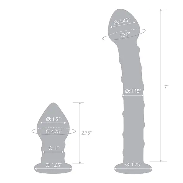 Ervaar de ultieme dubbele stimulatie met een tweedelige set met een dildo die is gebogen voor G-spot stimulatie en een gebruiksvriendelijke buttplug voor spelen op de achterdeur. Dit is een sensuele match made in heaven met twee lichaamsvriendelijke glazen speeltjes die kunnen worden verwarmd of gekoeld voor extra sensatie.
