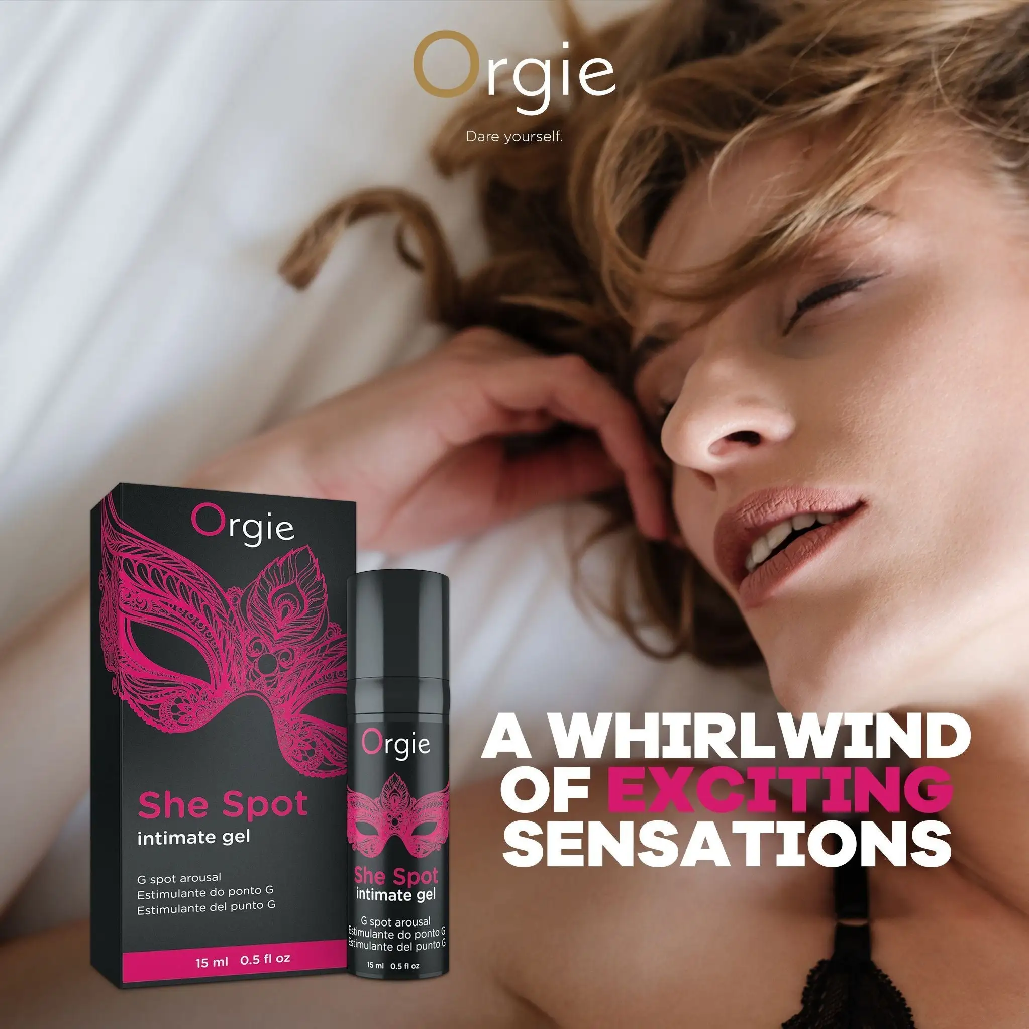 G-spot opwinding met de Orgie She Spot Stimulerende G-Spot Gel 15 ml. De G-spot wordt gekenmerkt als een erogene zone van de vagina die kan leiden tot hoge niveaus van seksuele opwinding, intense orgasmen en mogelijke vrouwelijke ejaculatie wanneer gestimuleerd wordt.