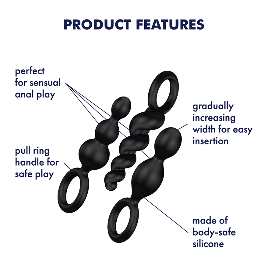 Met 3 verschillende structuren is de Booty Call set van Satisfyer ideaal voor beginners in de anale training. De anaalpluggen stimuleren met een oplopende diameter, op die manier wordt de anus zachtjes uitgerekt, zodat je er voorzichtig kennis mee kunt maken.
