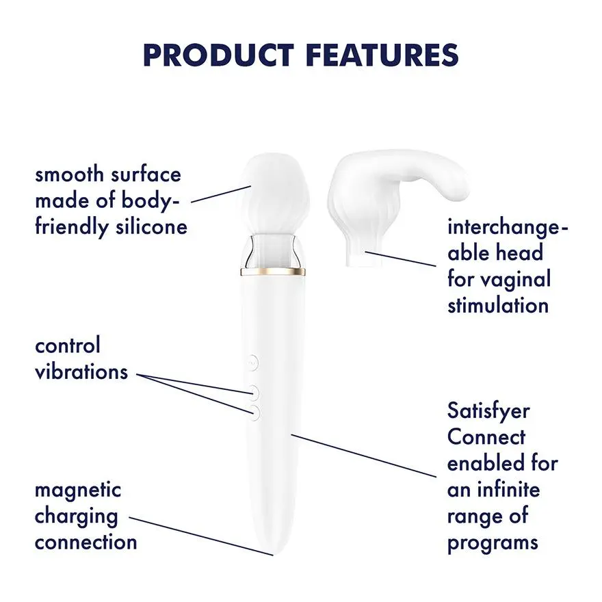 Onze Satisfyer Double Wand-er Wand Massager is bedoeld om je te helpen je lichaam met vertrouwen te verkennen. Uitgerust met twee verwisselbare koppen: een klassiek, rond massageopzetstuk en een opzetstuk voor het stimuleren van de G-spot of A-spot